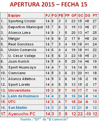 Tras su estrepitosa caída por 5 a 0 ante el Juan Aurich en el "César Flores" de Lambayeque, el Ayacucho FC ocupa la última posición del Apertura 2015. Situación alarmante a falta de 2 jornadas para culminar el segundo torneo del año.